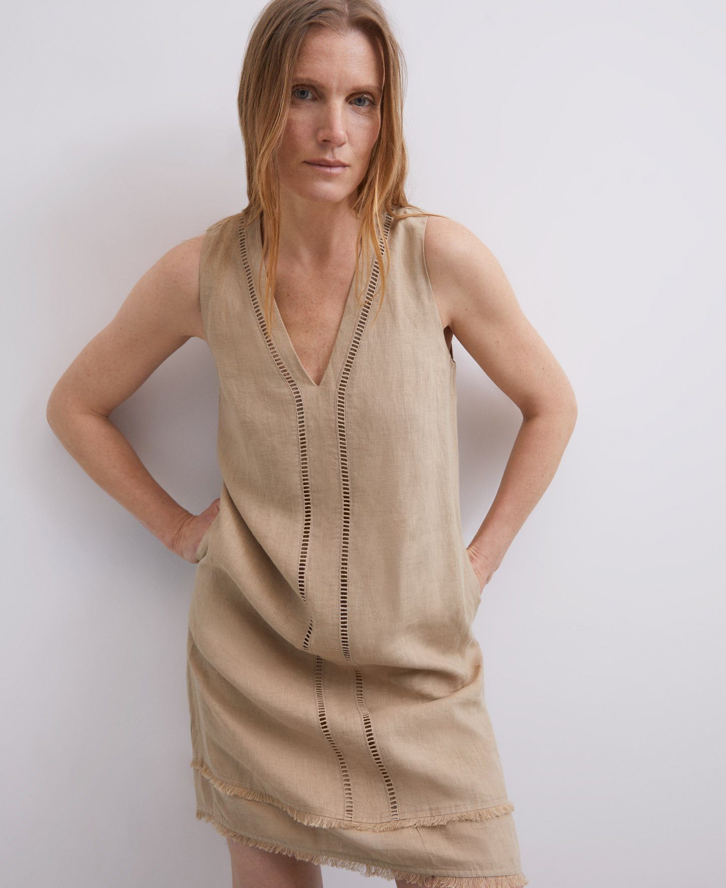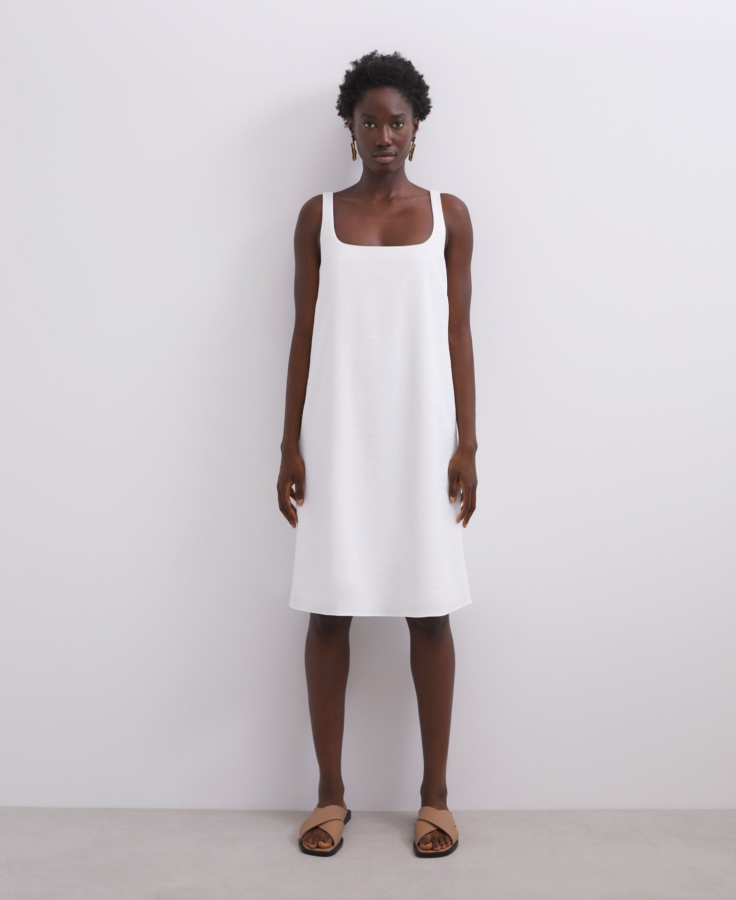 O tenemos también el vestido corto con cuello escote y elaborado en algodón blanco o también en algodón de color marrón.