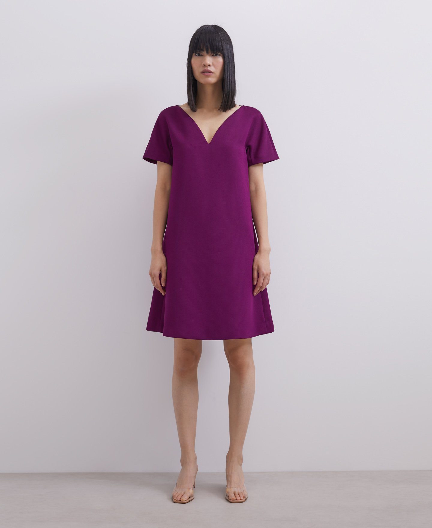 Si te gustan los vestidos cortos estás de enhorabuena porque la nueva colección de Adolfo Domínguez para veranoincluye muchos modelos entre los que destacan, el vestido corto con silueta en A que veis en la imagen en color púrpura o en rojo.