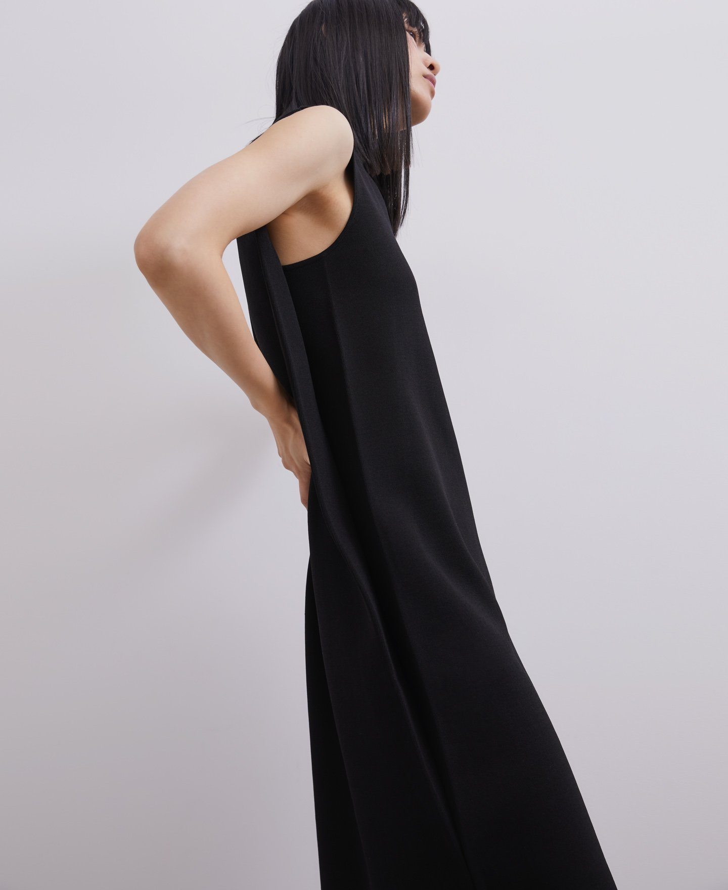 Comenzamos nuestro repaso a los vestidos vestidos Adolfo Domínguez para Veranofijándonos en aquellos modelos que son largos. Vestidos que tienen un diseño elegante para todo tipo de ocasiones con modelos que destacan como el vestido negro con escote barco de punto goma que veis a continuación.
