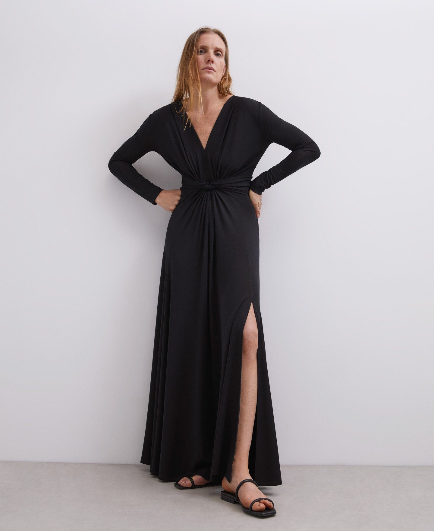 O el vestido largo con detalle en la cintura y de nuevo en color negro o si lo preferís en color borgoña.