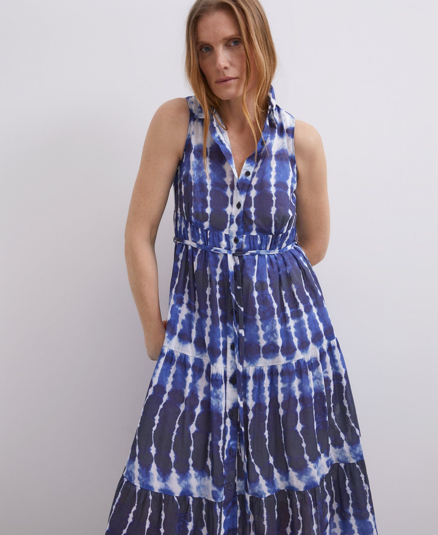 Los vestidos midi son también protagonistas en la nueva colección de Adolfo Domínguez para verano, con modelos realmente espectaculares como el vestido de cuello camisero con estampado de colores azules.