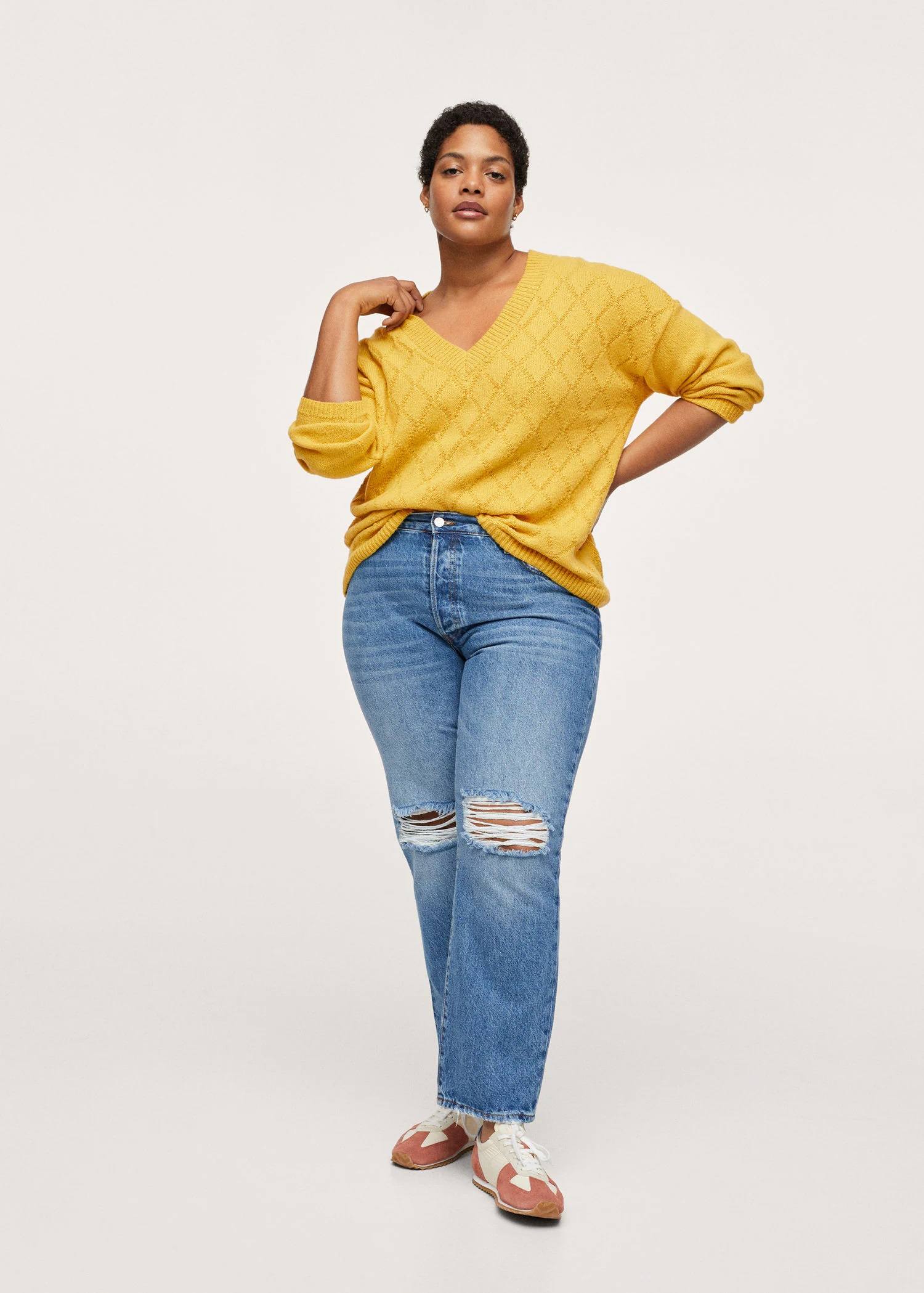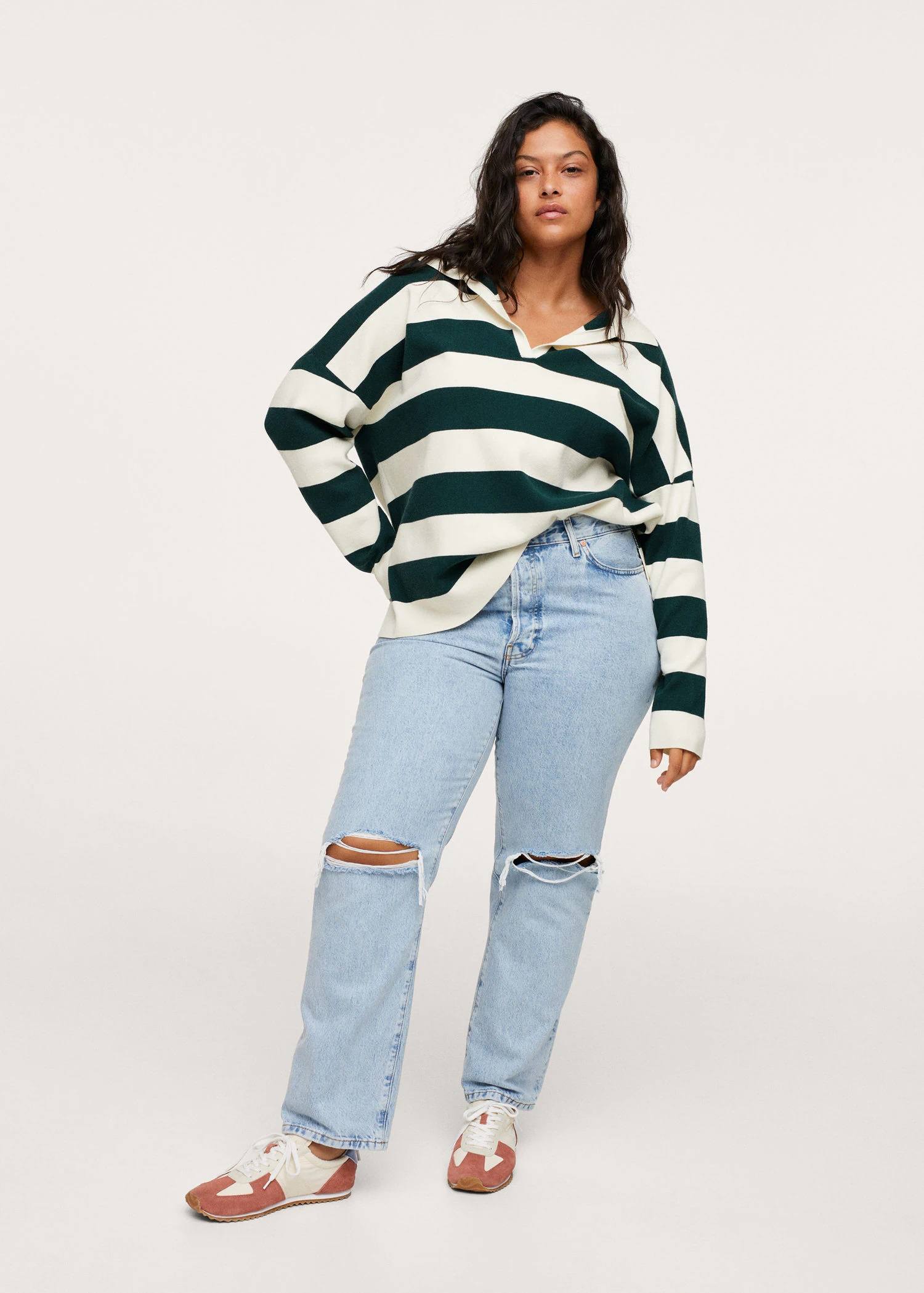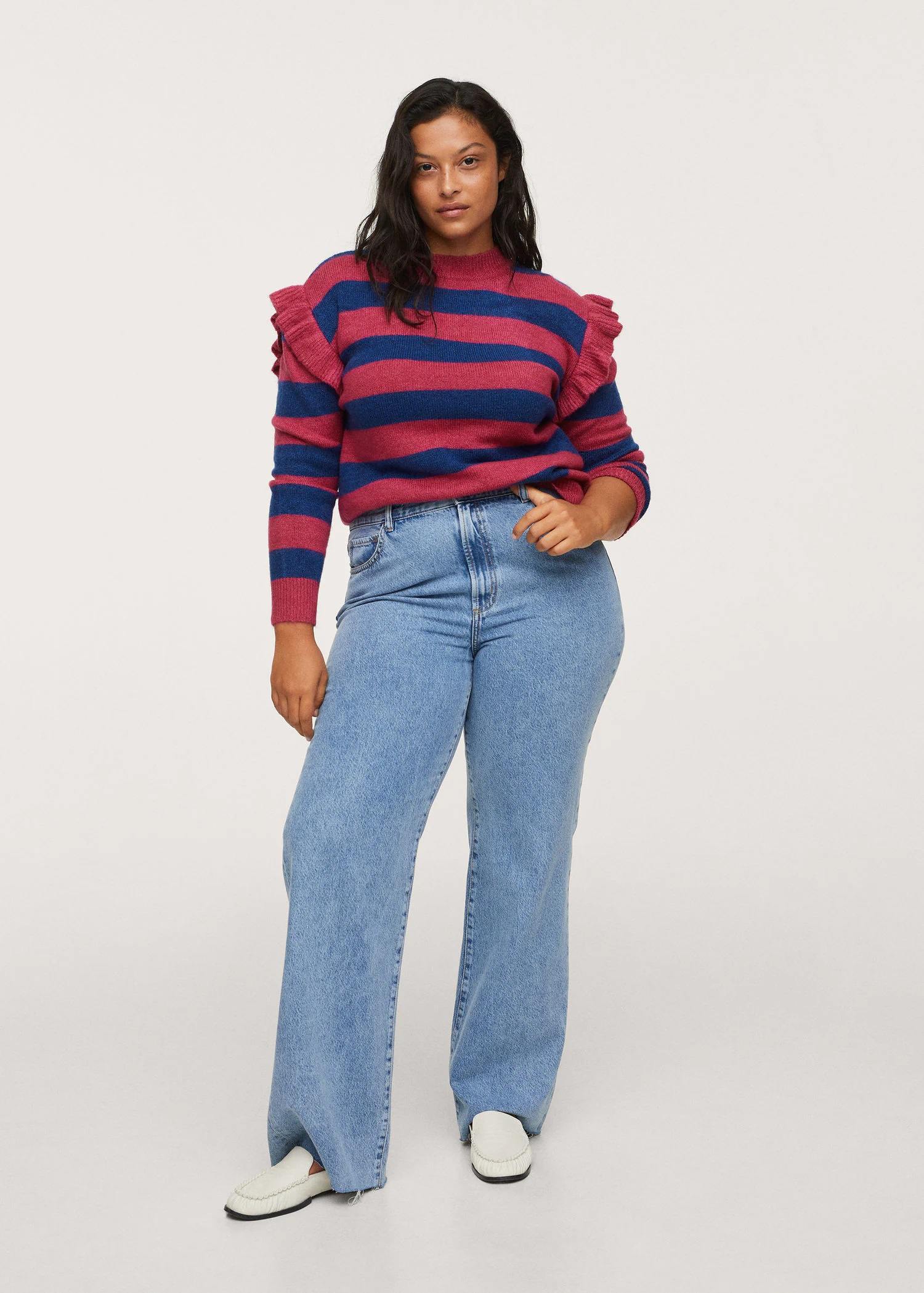 En cuanto a jerséis, el catálogo de Mango Otoño Invierno en tallas plus, se llena de modelos de pico y modelos muy de estilo «oversize» en los que aparecen detalles que son tendencia como el estampado de rayas o los volantes.