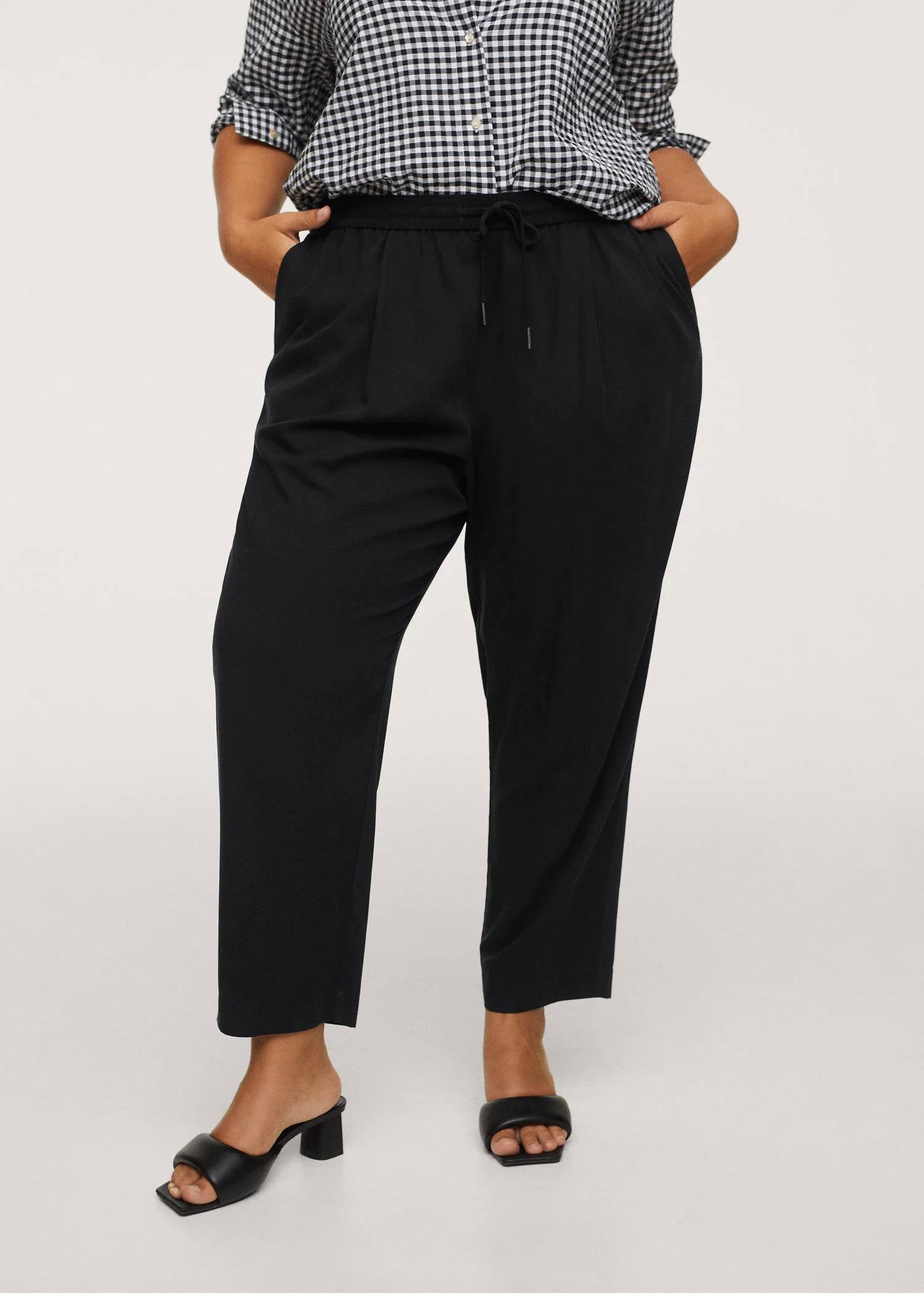 Para combinar con las camisas y blusas, así como los jerséis dentro del Catálogo de Tallas Plus de Mango Otoño Invierno nada como elegir también los pantalones que os mostramos. Modelos de pantalones que cuentan con cintura elástica o el modelo recto con botones que vemos en esta imagen.